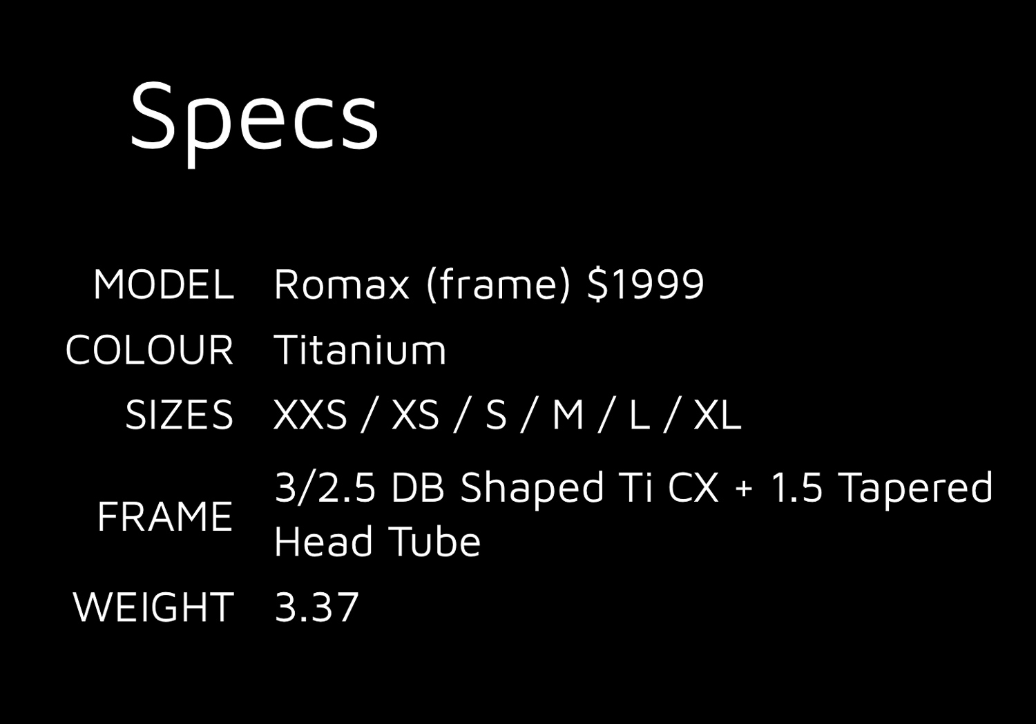 Cyclocross specific? Perhaps. It's a racer for sure, but the titanium Romax gives you the perfect platform for adventure riding, gravel grinding, or ripping your local race course. Save the grass? Grass grows back. Its excellent CX geometry takes advantage of Titanium's strength and weight in shaped and butted tubing selected by our product designer Bruce Spicer. This frame will outlast you, and make you better for it.